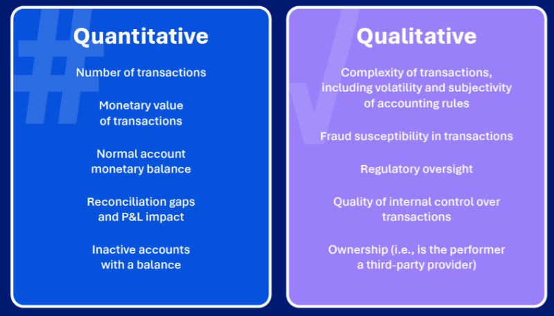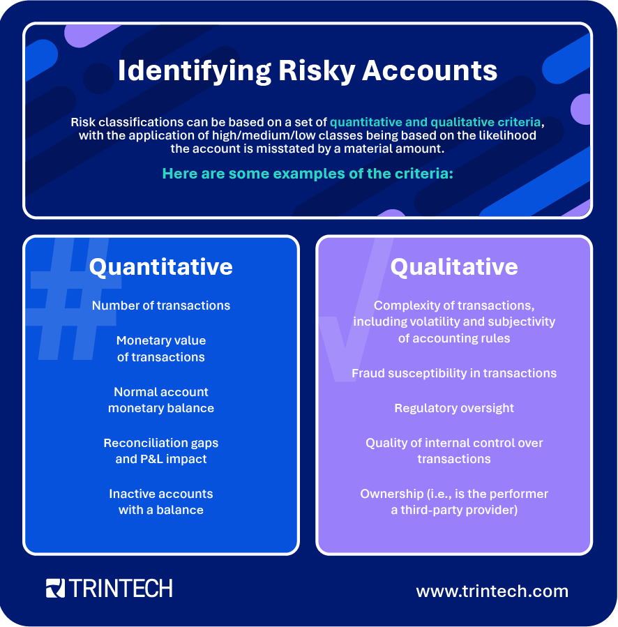 Clearly, we need a way to identify risky accounts, as this is an easy way to accelerate the process, and at the same time reduce the risk of financial restatements. Risk classifications can be based on a set of quantitative and qualitative criteria, with the application of high/medium/low classes being based on the likelihood the account is misstated by a material amount (rule of thumb is that accounts will be assigned a higher risk when it is more likely to be materially misstated). Here are some examples of the criteria: