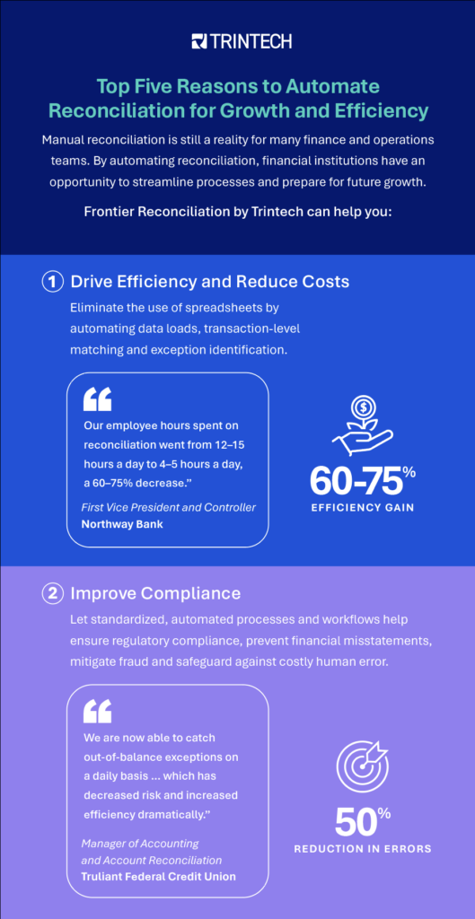 Manual reconciliation is still a reality for many finance and operations teams. By automating reconciliation, financial institutions have an opportunity to streamline processes and prepare for future growth. Learn how Frontier by Trintech helps.